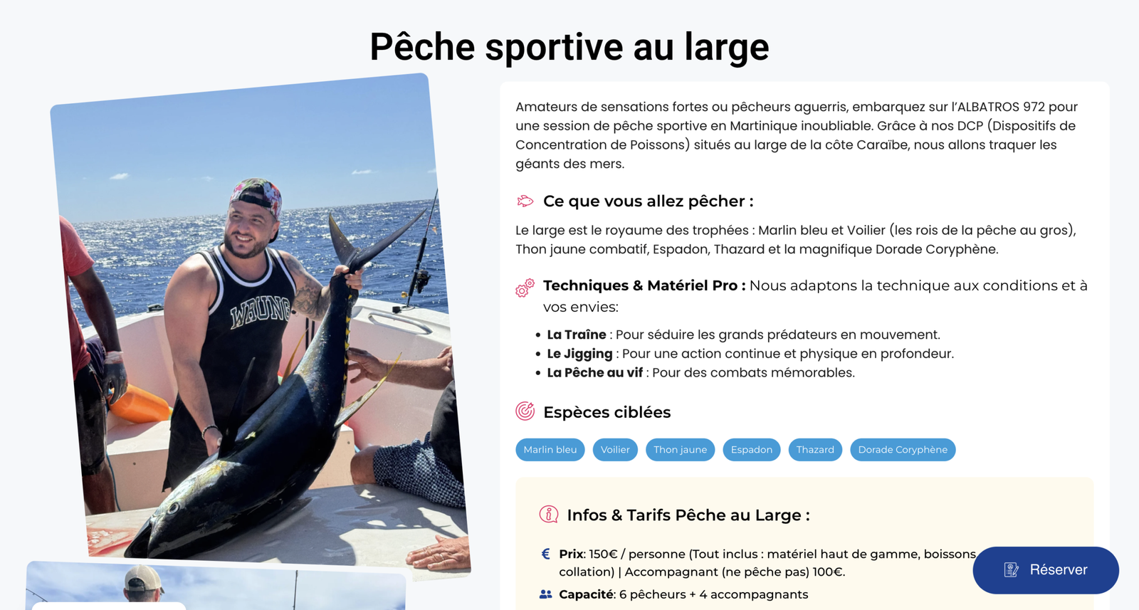 Solution : Conception d’une plateforme immersive orientée storytelling, mettant en avant l’aventure et l’expertise de 15 ans du capitaine. Intégration d’un système de réservation intelligent via Amelia avec fenêtres modales (Popups) optimisées pour mobile et paiement sécurisé Stripe pour la gestion automatique des acomptes.